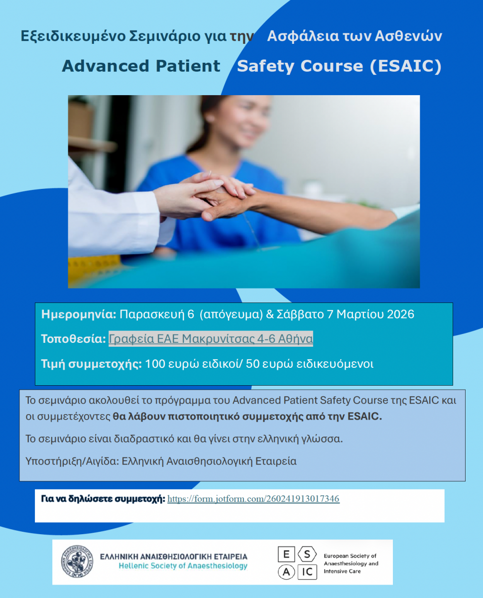 Η Ελλάδα και η Ελληνική Αναισθησιολογική Εταιρεία (ΕΑΕ) αποτελούν επίσημο φορέα υλοποίησης του Advanced Patient Safety Course (APSC) της ESAIC.