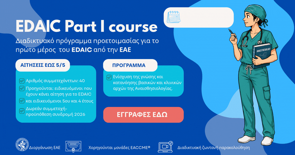 Η Ελληνική Αναισθησιολογική Εταιρεία (ΕΑΕ) στα πλαίσια μιας προσπάθειας ενίσχυσης του ΕDAIC και υποστήριξης των ειδικευόμενων διοργανώνει πρόγραμμα προετοιμασίας για το πρώτο μέρος (γραπτές εξετάσεις) του Ευρωπαϊκού Διπλώματος Αναισθησιολογίας και Εντατικής Θεραπείας (EDAIC Part I) και σας προσκαλεί να συμμετάσχετε!
